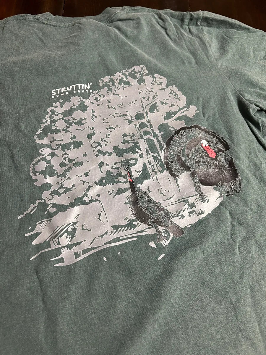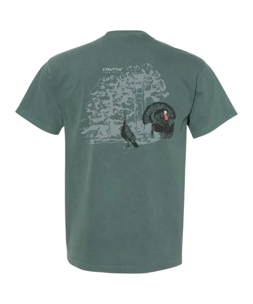 Experience lasting comfort with the Comfort Color Blue Spruce Pocket T-Shirt featuring “Turkeys in the Hardwoods.” Crafted from soft, 100% cotton ring-spun fabric, this garment-dyed tee offers a lived-in feel with minimal shrinkage. Its relaxed fit, seamless body, and classic rib collar ensure easy wear, while details like a left chest pocket, topstitched finish, twill label, and shoulder-to-shoulder twill tape enhance durability. Made using OEKO-TEX certified low-impact dyes, this shirt reflects a commitment to quality and sustainability as a proud member of the U.S. Cotton Trust Protocol.